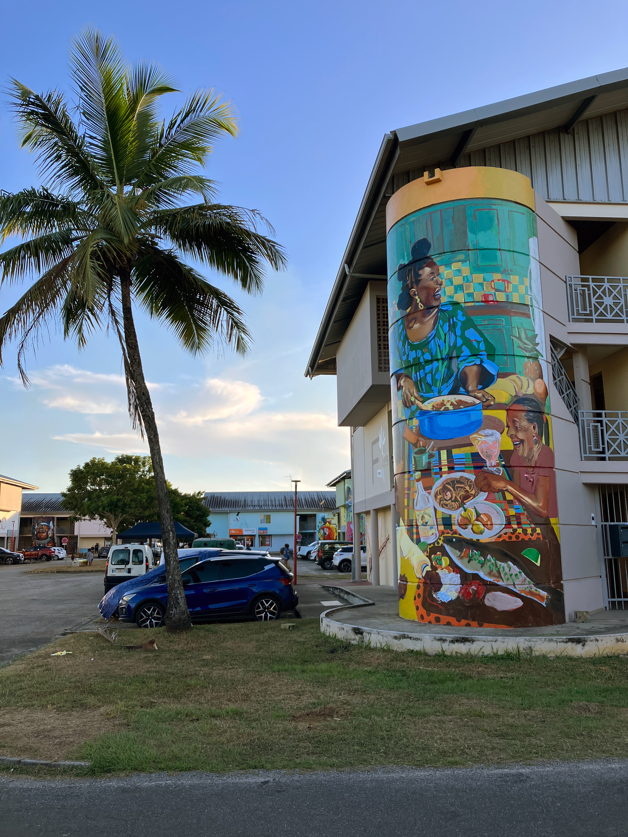 We created this mural as part of ATIP’ART FESTIVAL DE STREET ART’s 5th Edition in French Guiana. Painted in acrylic and spray paint, this mural depicts a family meal. Each member of the family comes from a different ethnic group. Inspired directly by the colors and community of this diverse South American region, French Guiana is a land of welcome, bringing together Creole, Indigenous, Bushinengué, Brazilian and Hmong populations and many more. It’s an explosion of textures and flavors—with stories, jokes and good-naturedness intertwining as they might around the table.