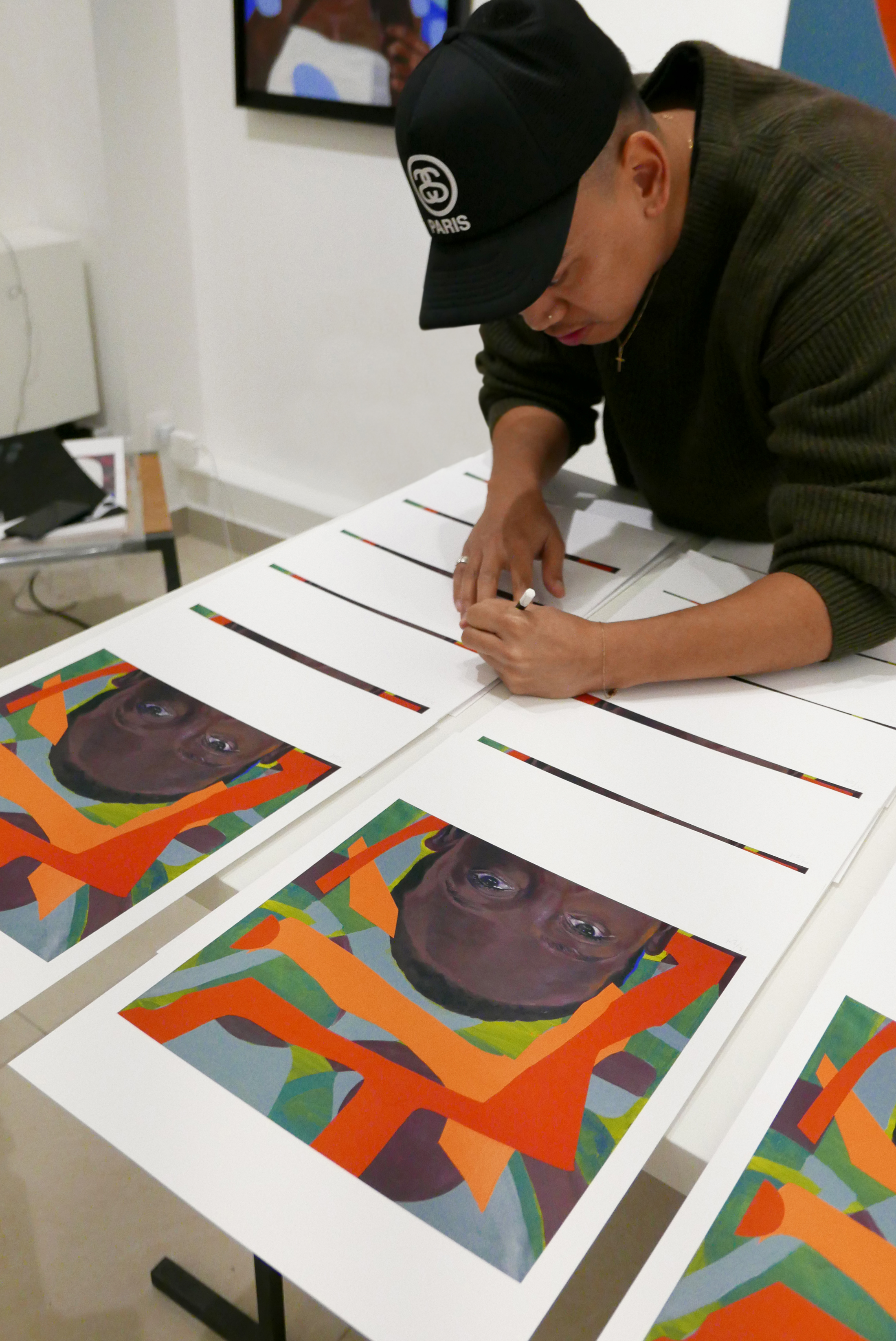 En complément de ces sujets, une collection d'œuvres sur papier de l’artiste Sun.C. Des touches de peinture fortes et circulaires imitant les marques d'un stylo de peinture graffiti se réunissent dans une forme contemporaine de pointillisme. Les visages sont formés comme des constellations, s'alignant sur sa pratique continue de cartographier la galaxie dans la peau de ses sujets lorsqu'il peint sur les murs de la ville.