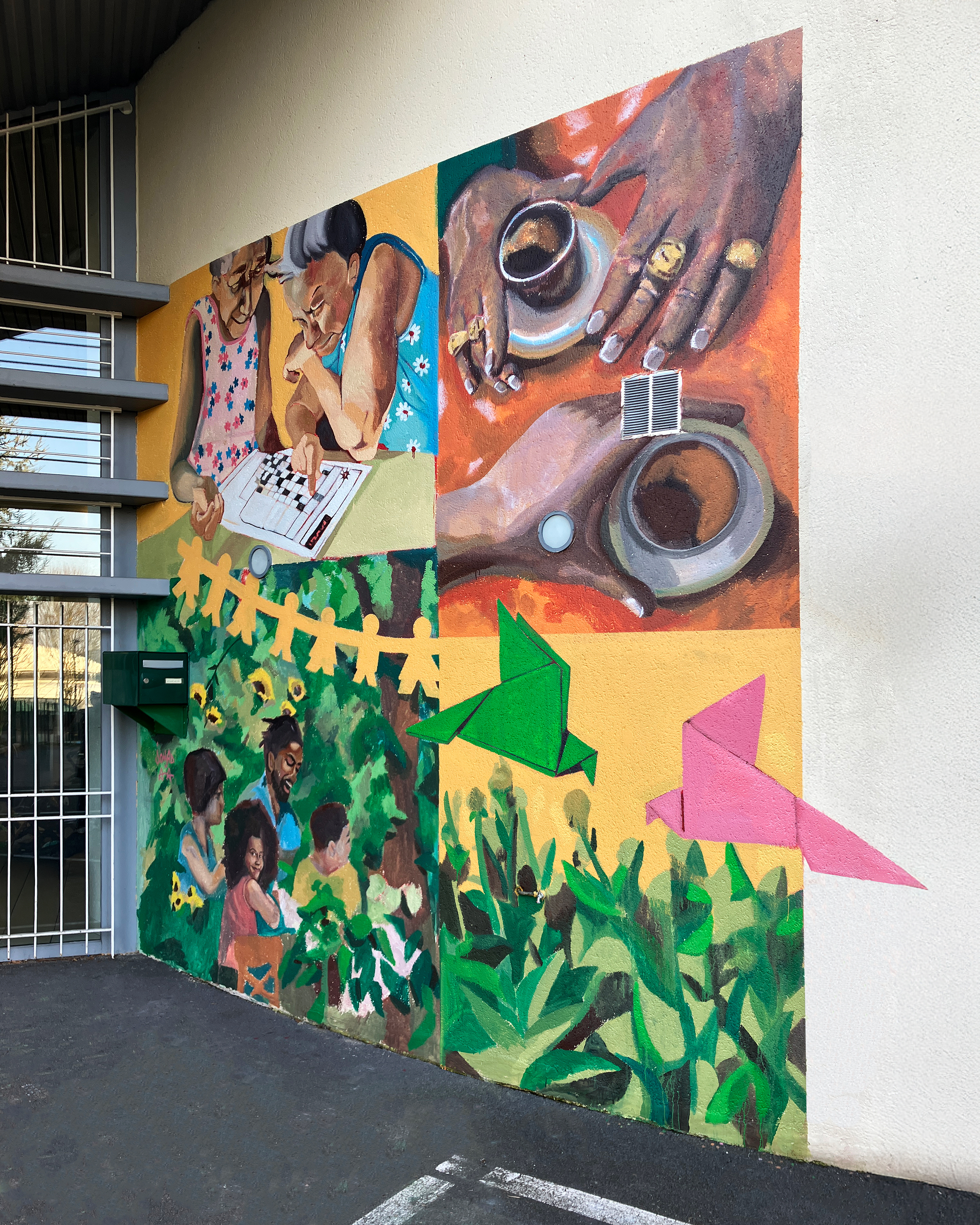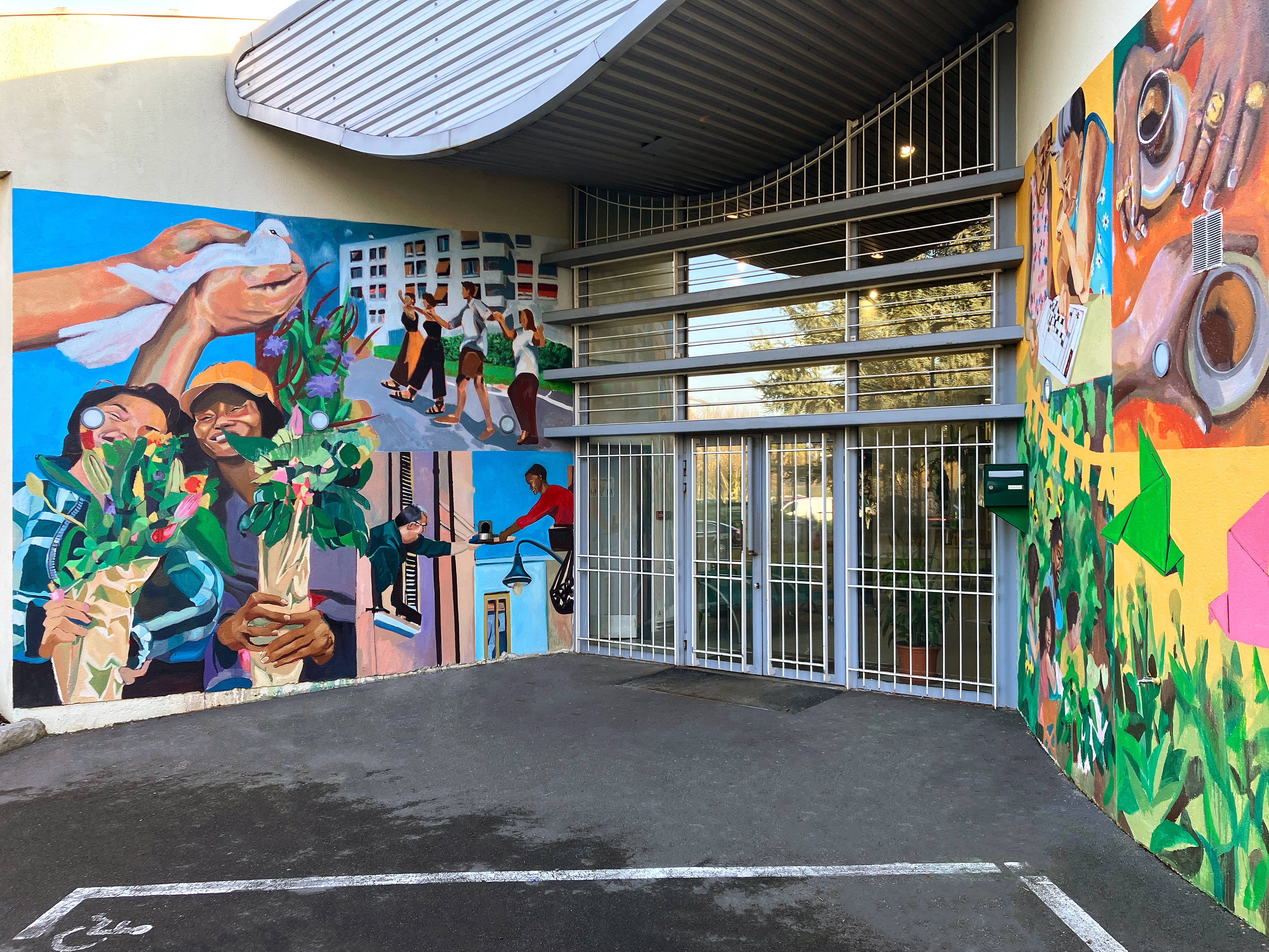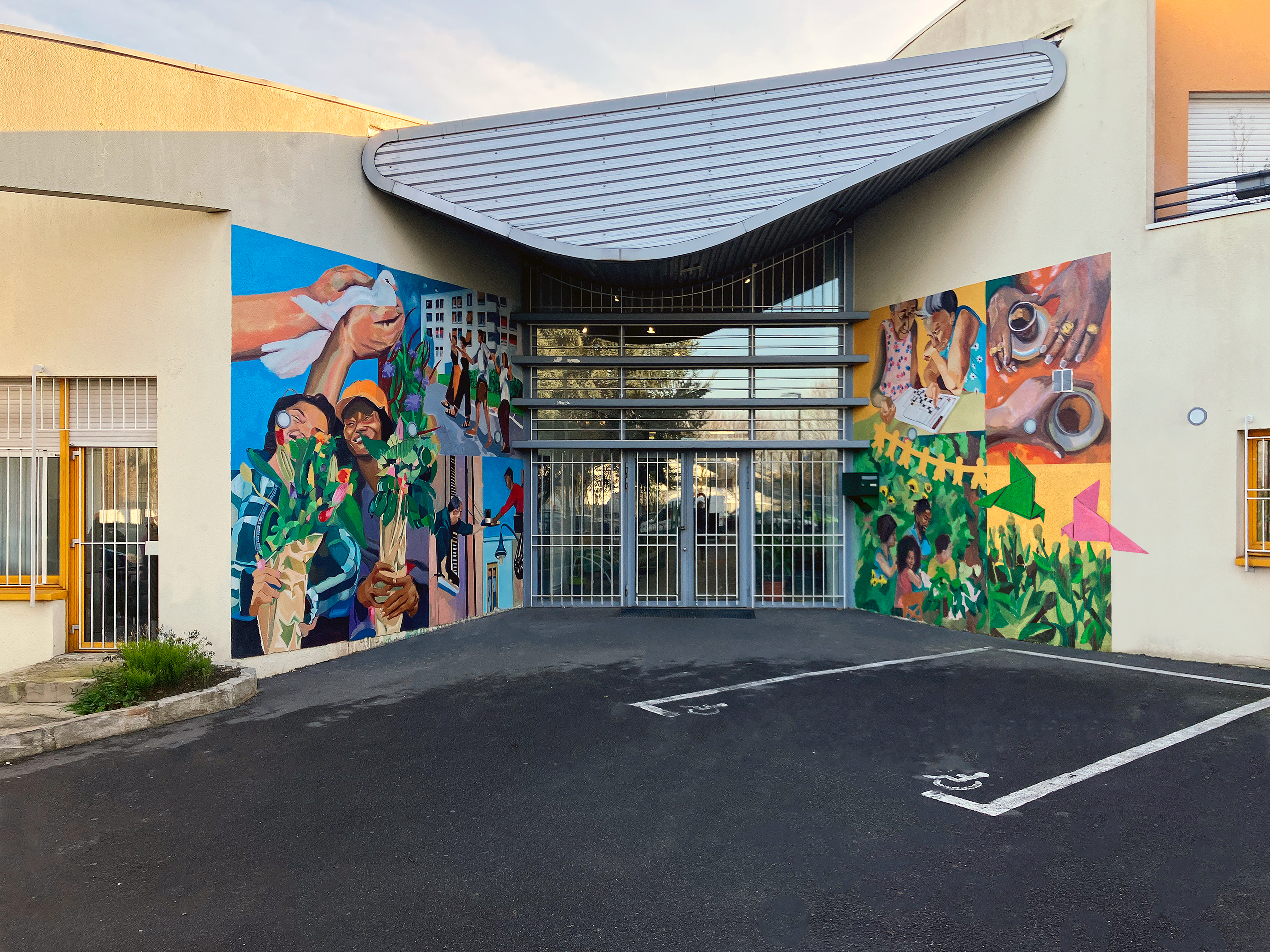 This pair of murals was painted at the Maison de Quartier Valéry Watteau to celebrate le Mois de la Paix à Sarcelles. Commissioned by the Ville Fraternelle Sarcelles, it includes symbols of peace and moments of togetherness, with a focus on the ethnic diversity of Sarcelles along with the generational ranges reflected at the community center.
