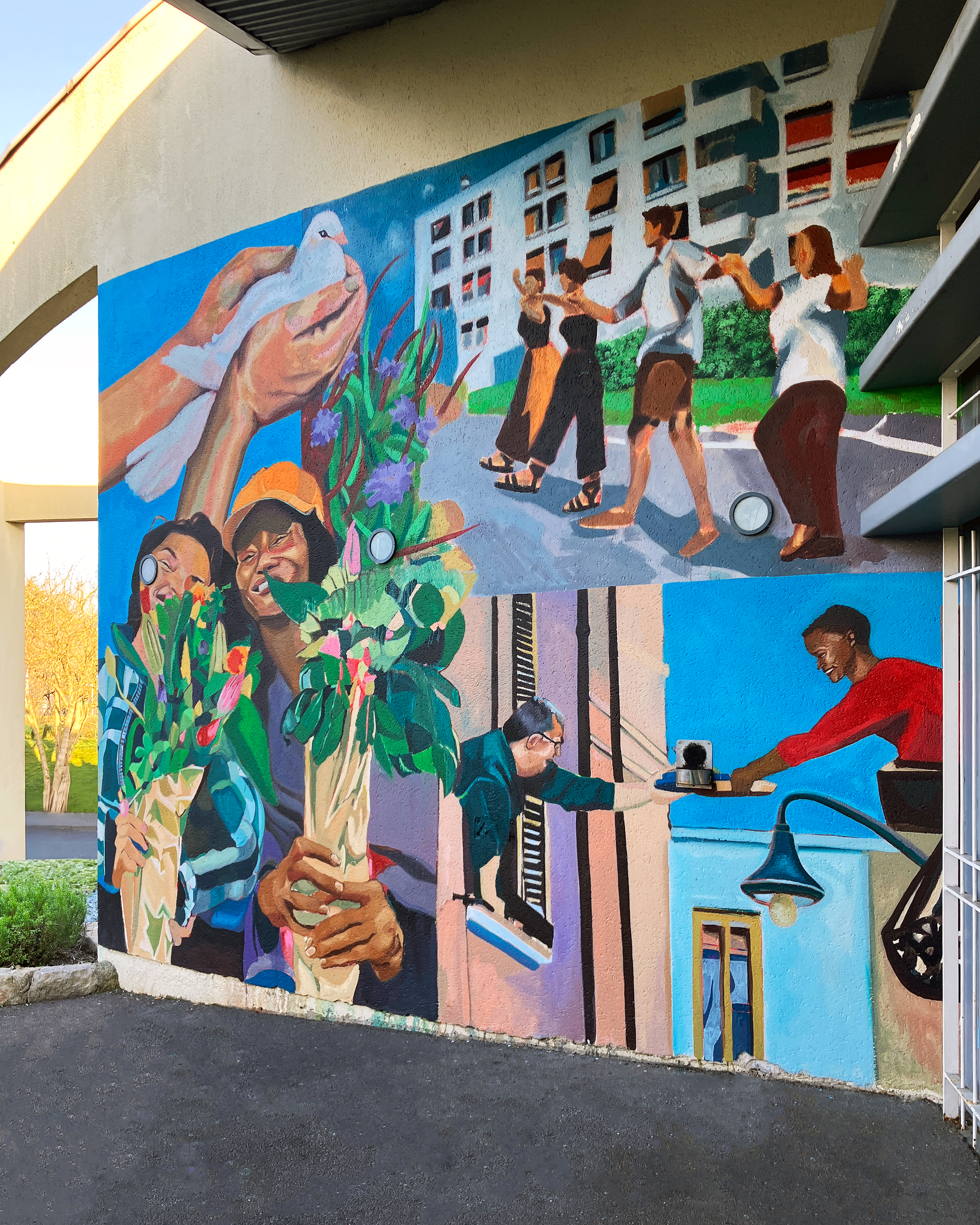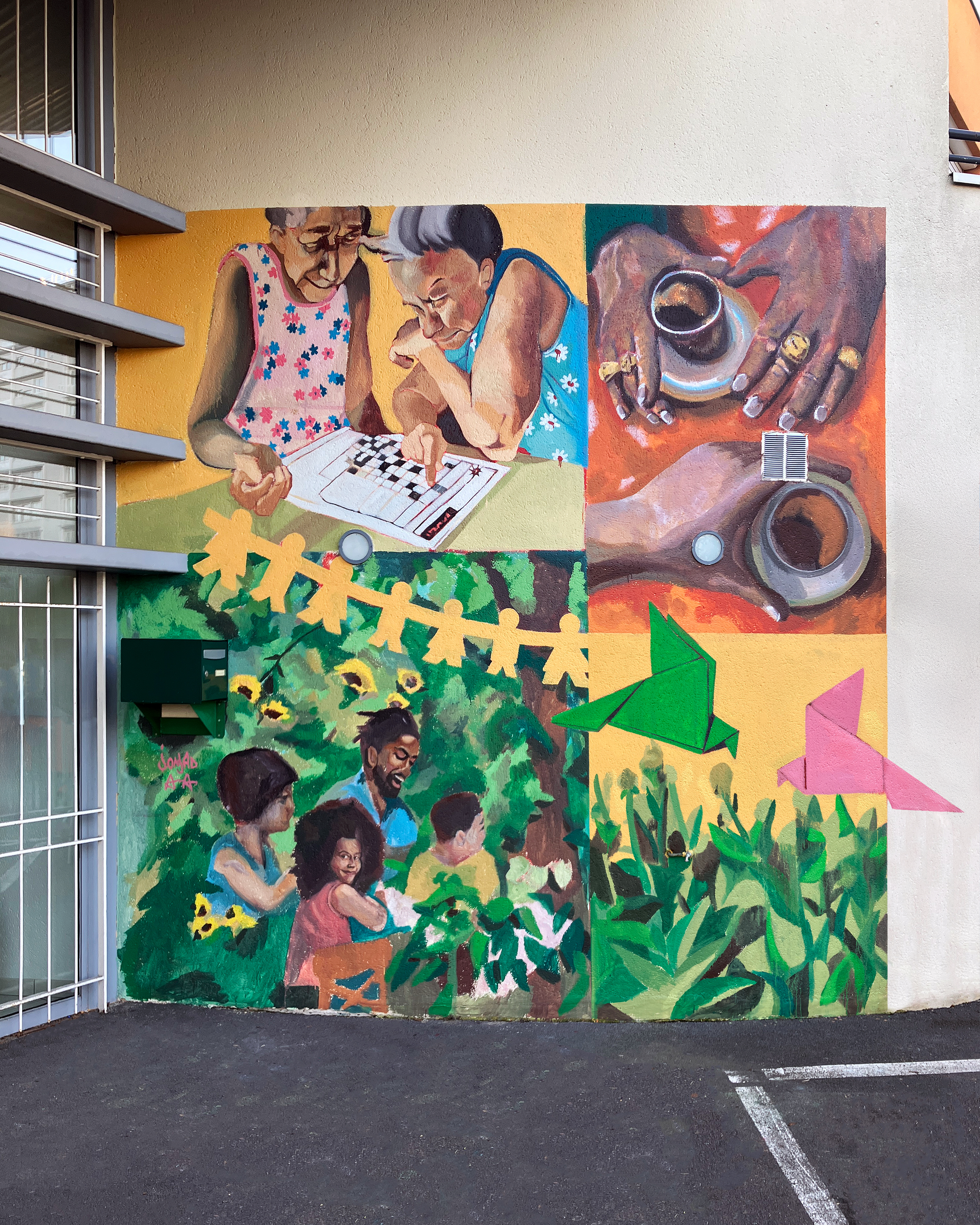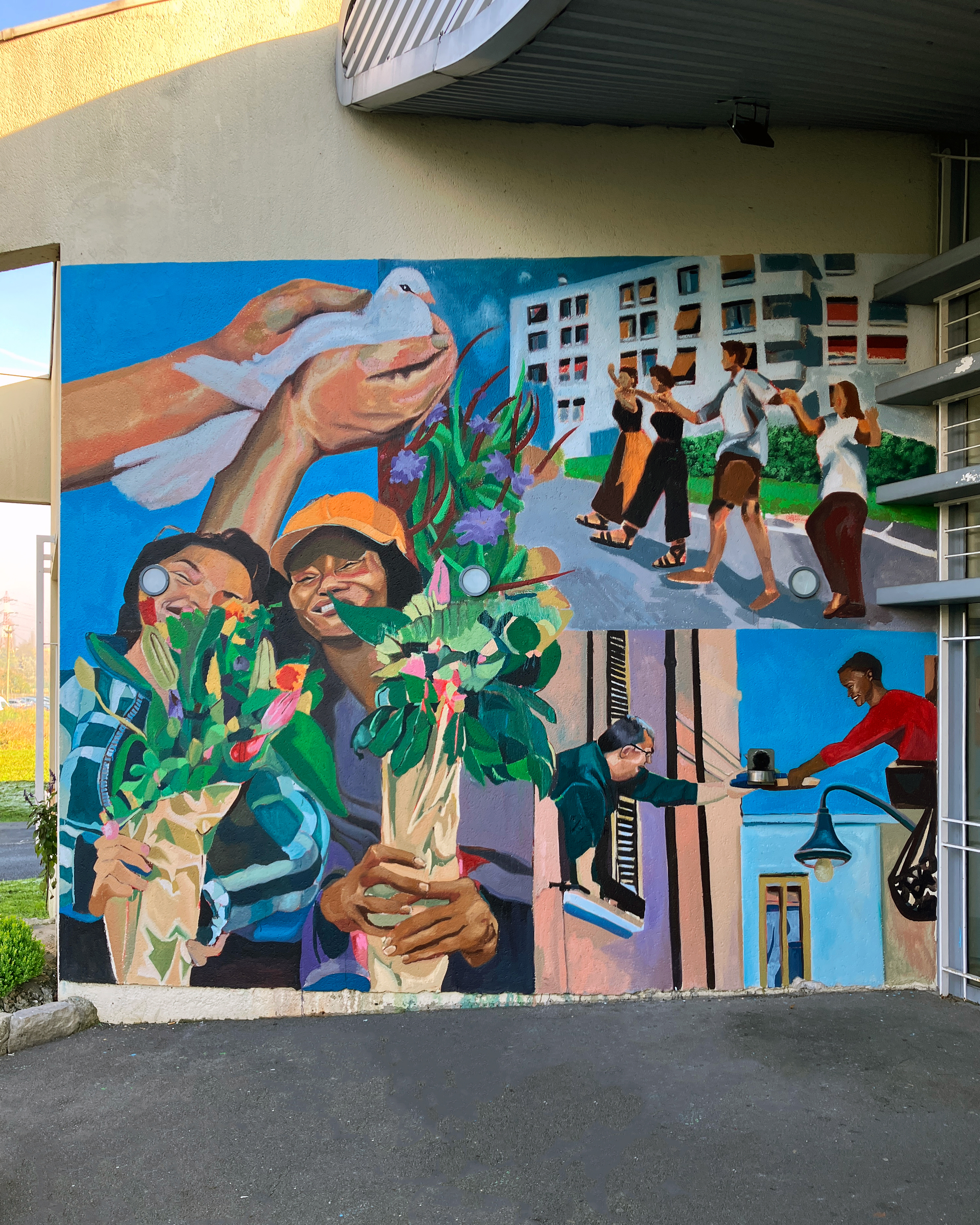 This pair of murals was painted at the Maison de Quartier Valéry Watteau to celebrate le Mois de la Paix à Sarcelles. Commissioned by the Ville Fraternelle Sarcelles, it includes symbols of peace and moments of togetherness, with a focus on the ethnic diversity of Sarcelles along with the generational ranges reflected at the community center.